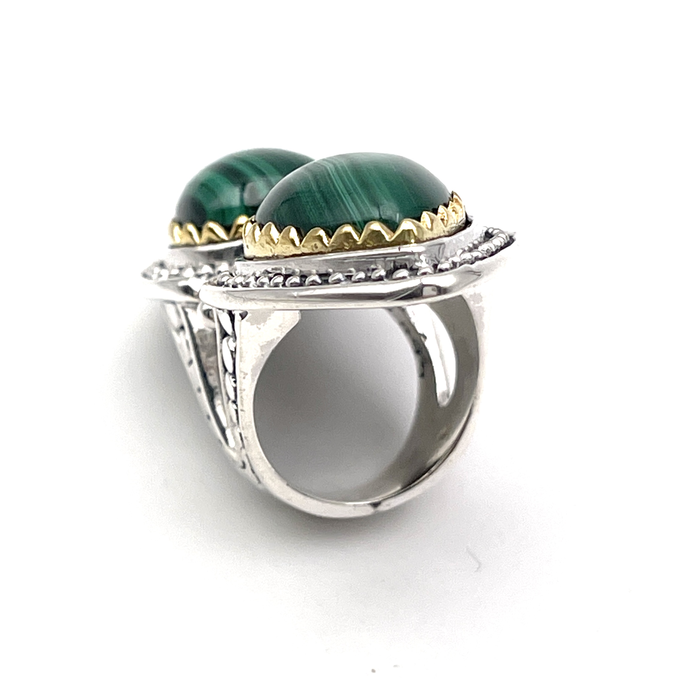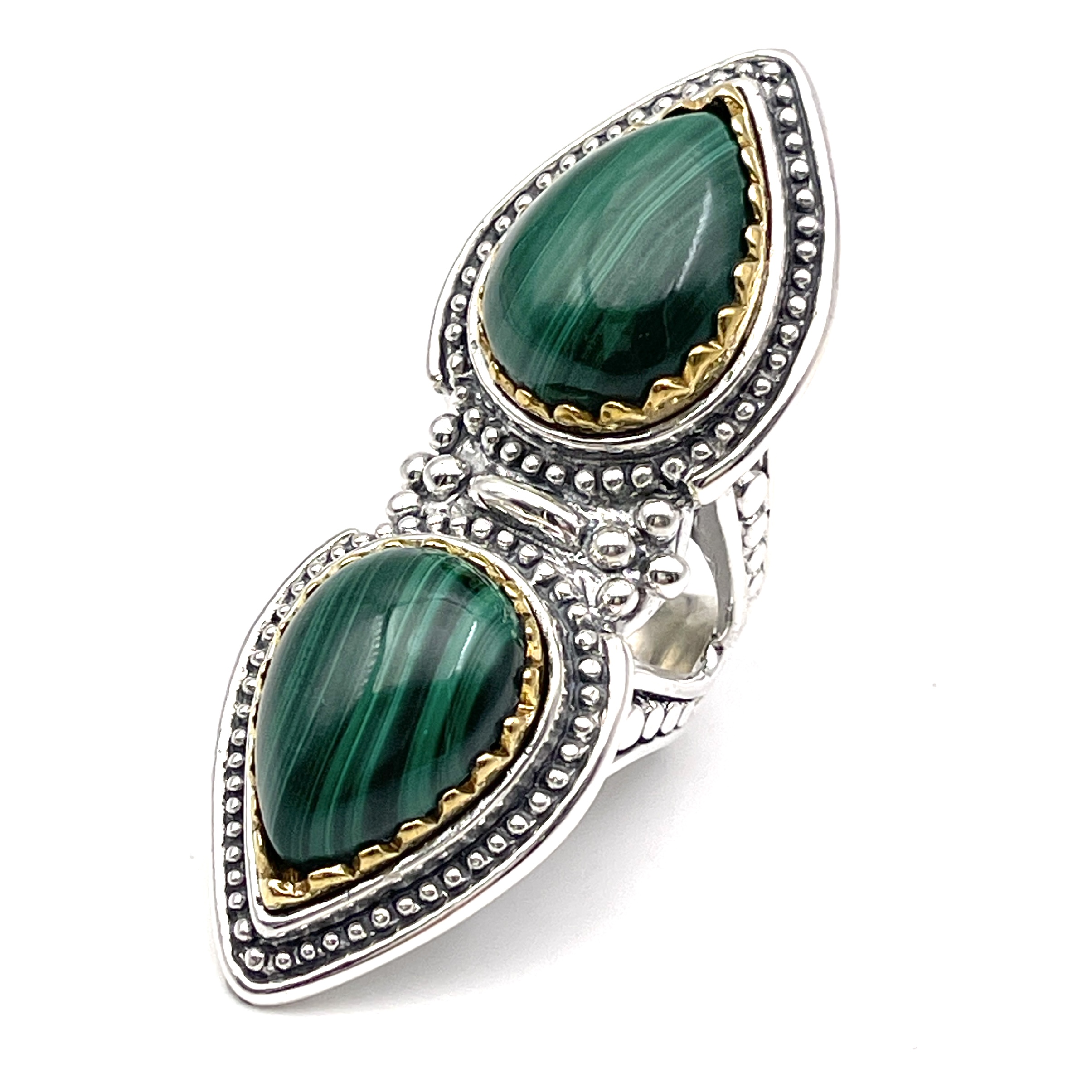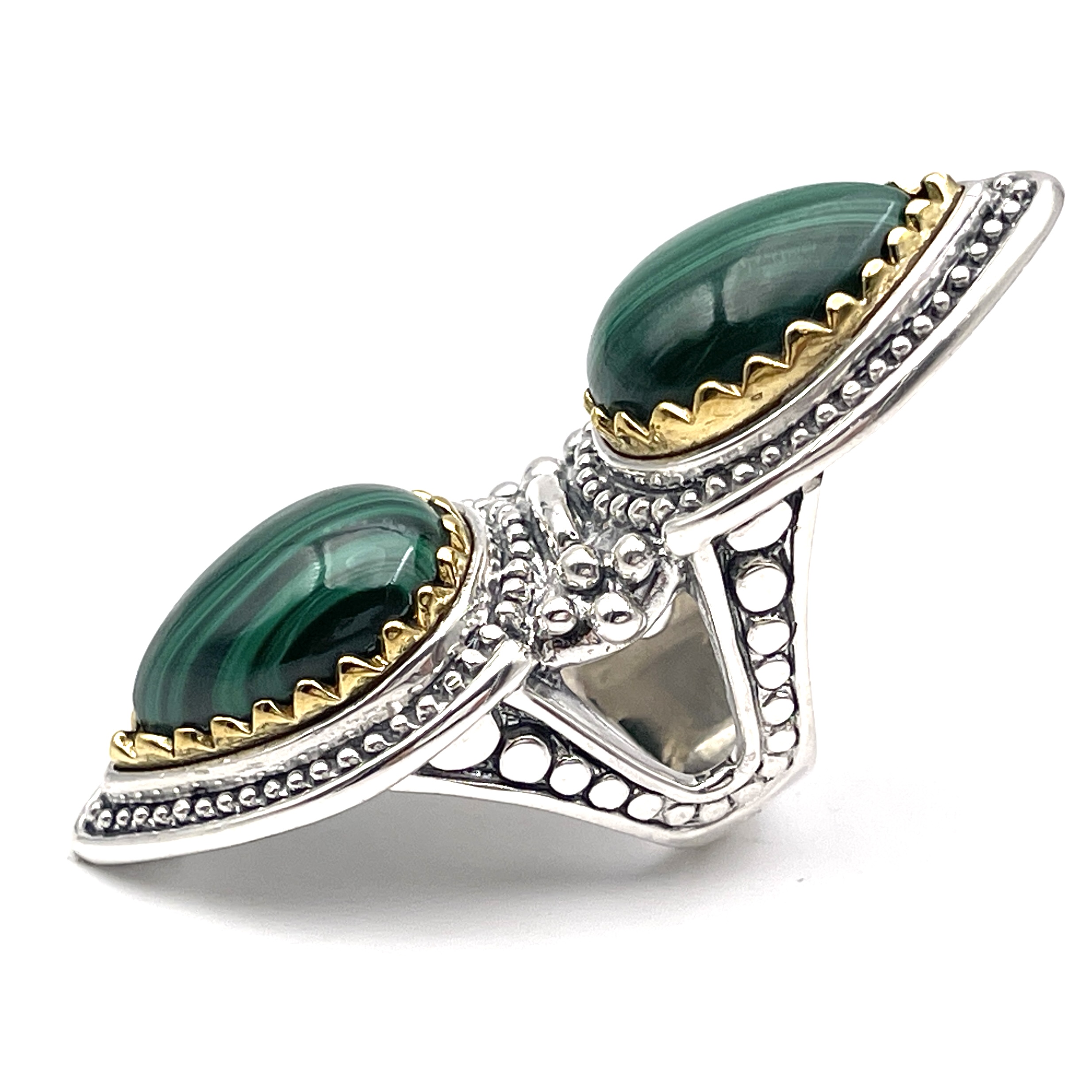 Bague longue en argent 925 avec 2 pierres malachites serties de laiton