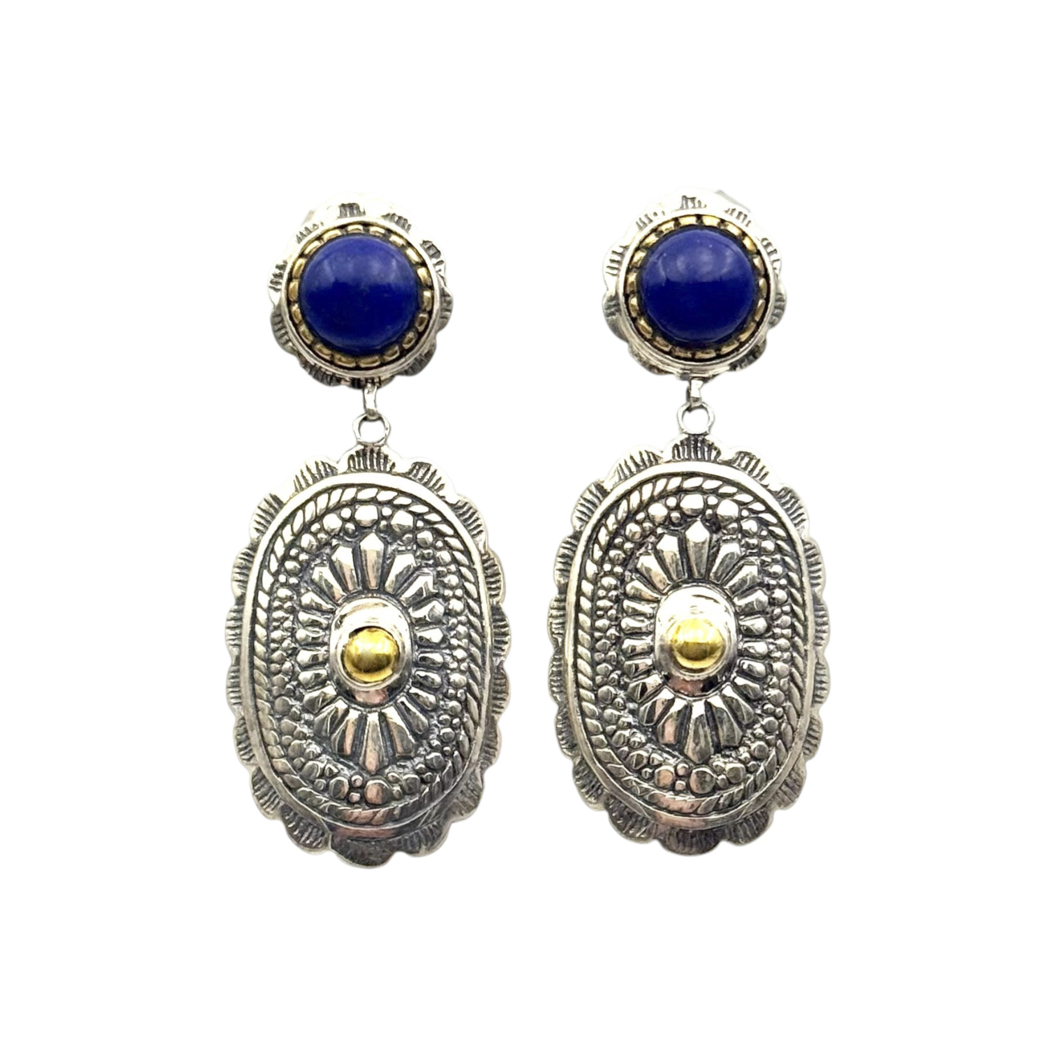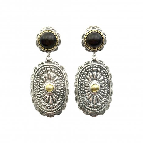 Boucles d'oreilles en Argent 925 avec pierre semi-précieuse sertie de Laiton sur la partie haute et petit centre en Laiton sur la partie basse.