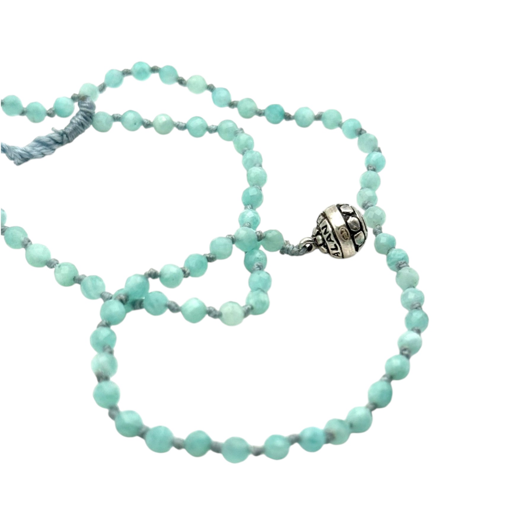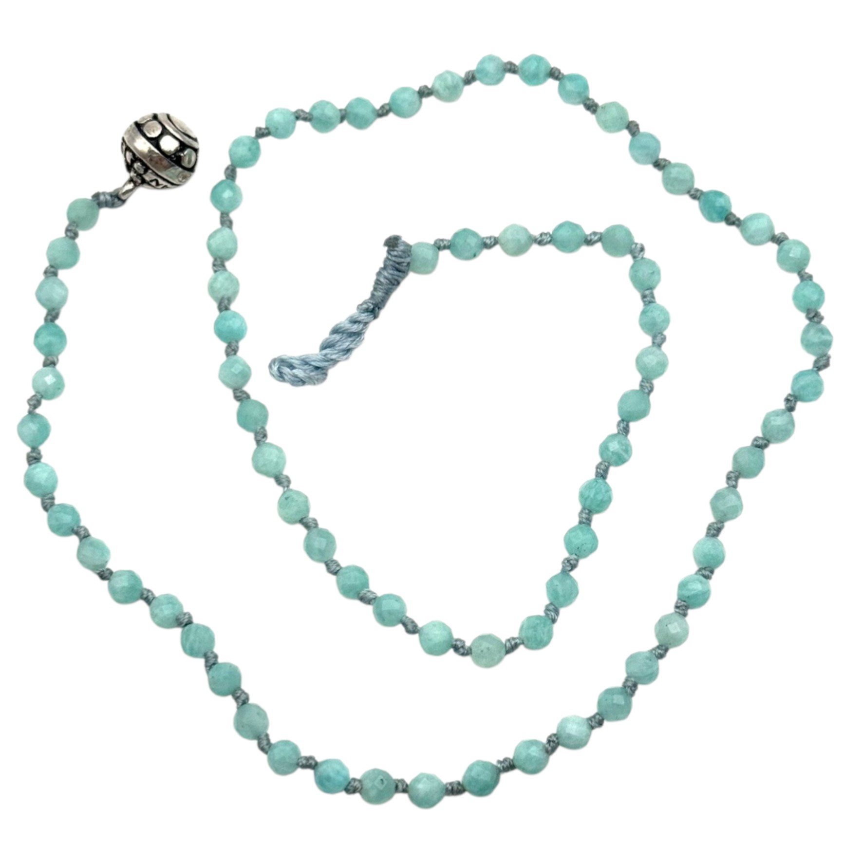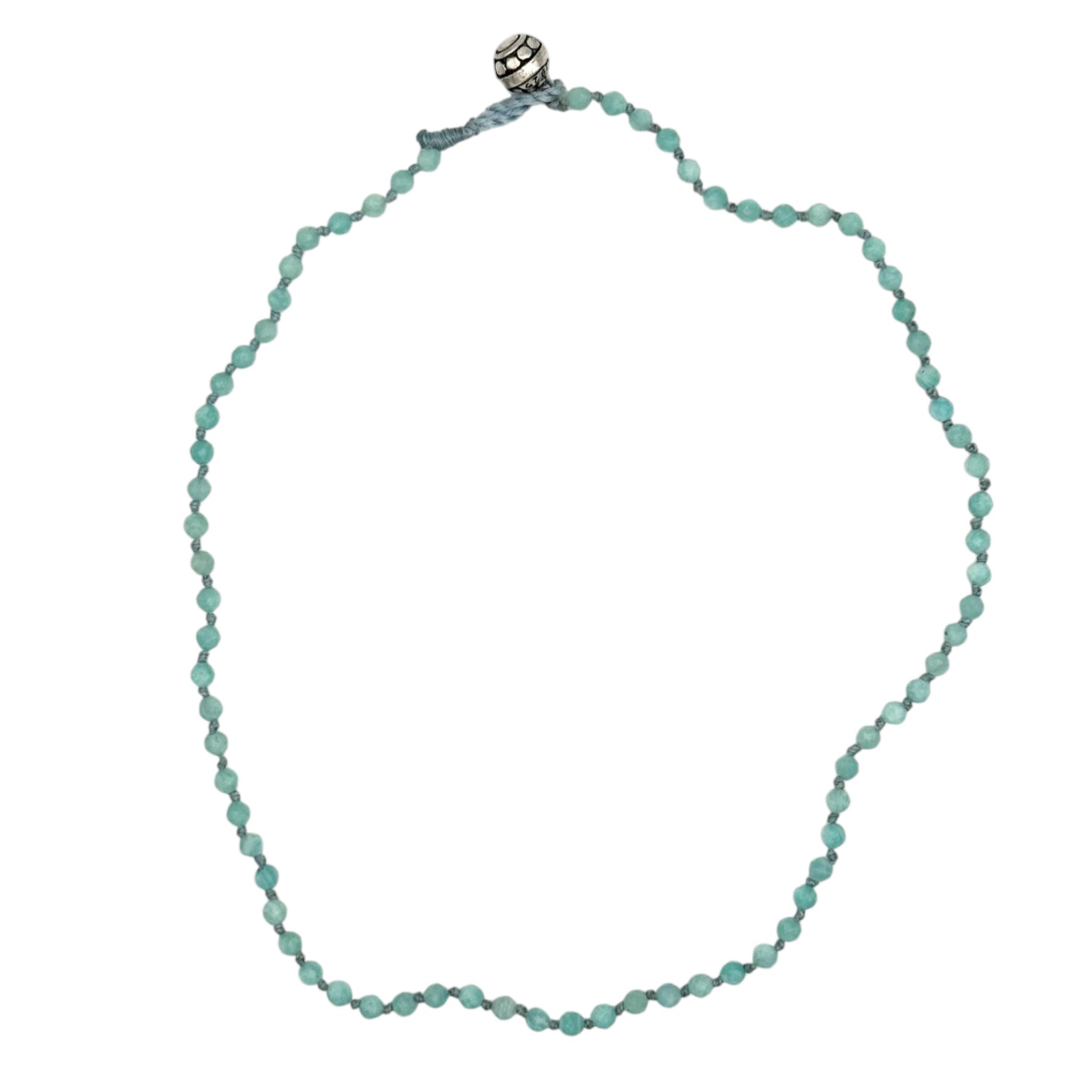 Collier sur lien composé de perles d'amazonite facettées de 4mm de diamètre séparées chacune par un noeud
