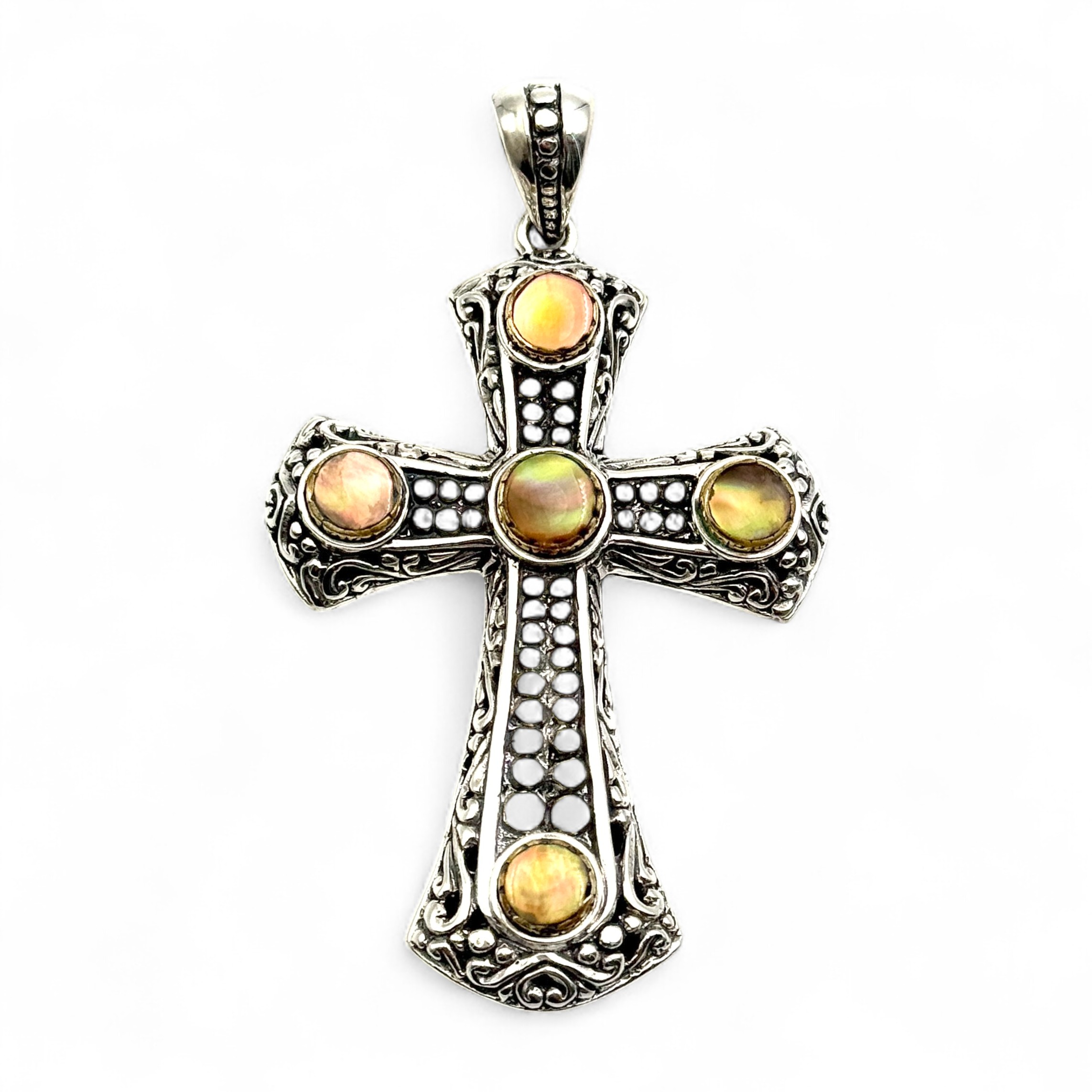 Grand pendentif croix en argent 925 avec nacres dorées serties de laiton