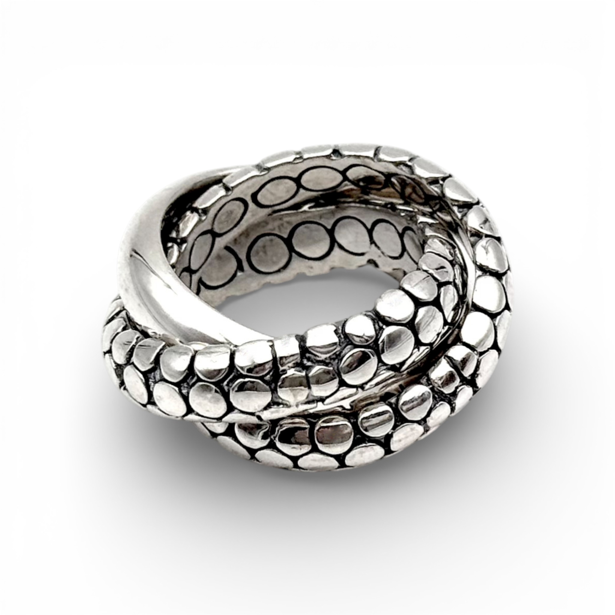 Bague en argent 925 composée de trois anneaux entremêlés dont deux anneaux travaillés et un anneau lisse.