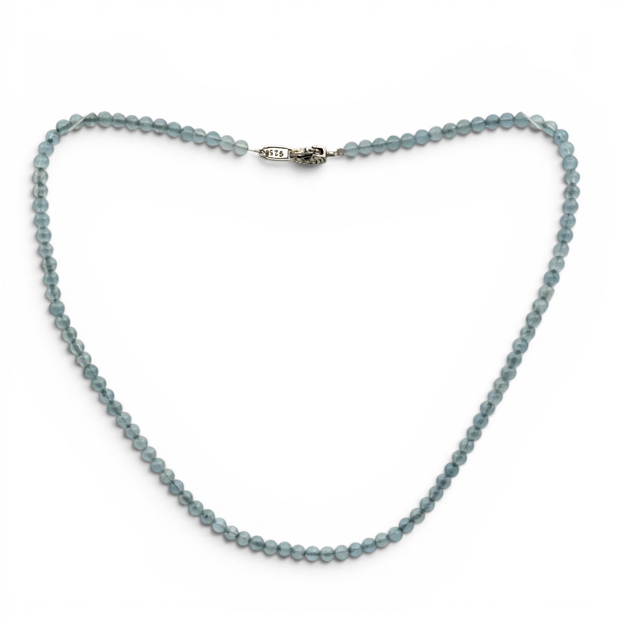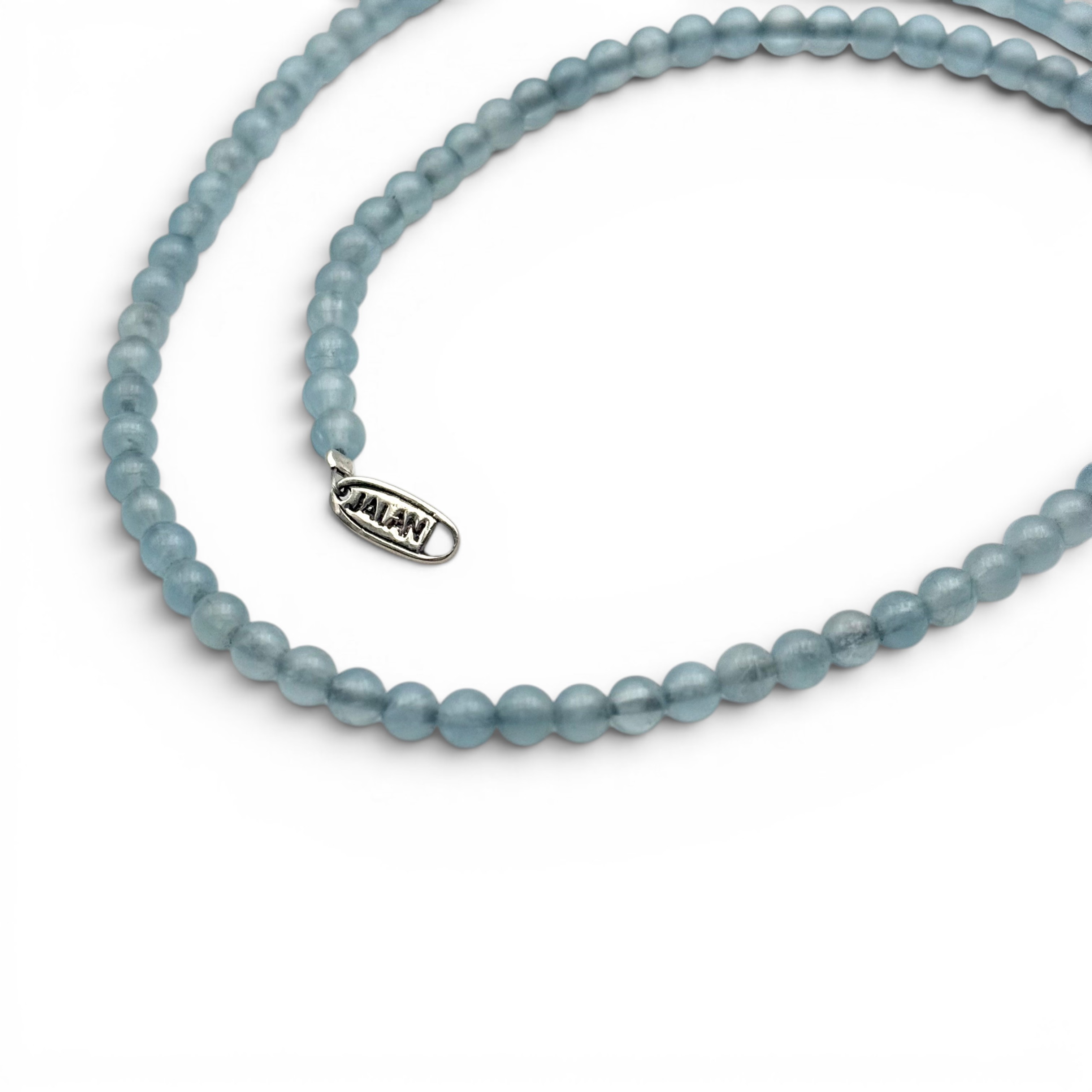 Collier sur fil cablé composé de perles d'aigue marine de 4mm de diamètre.