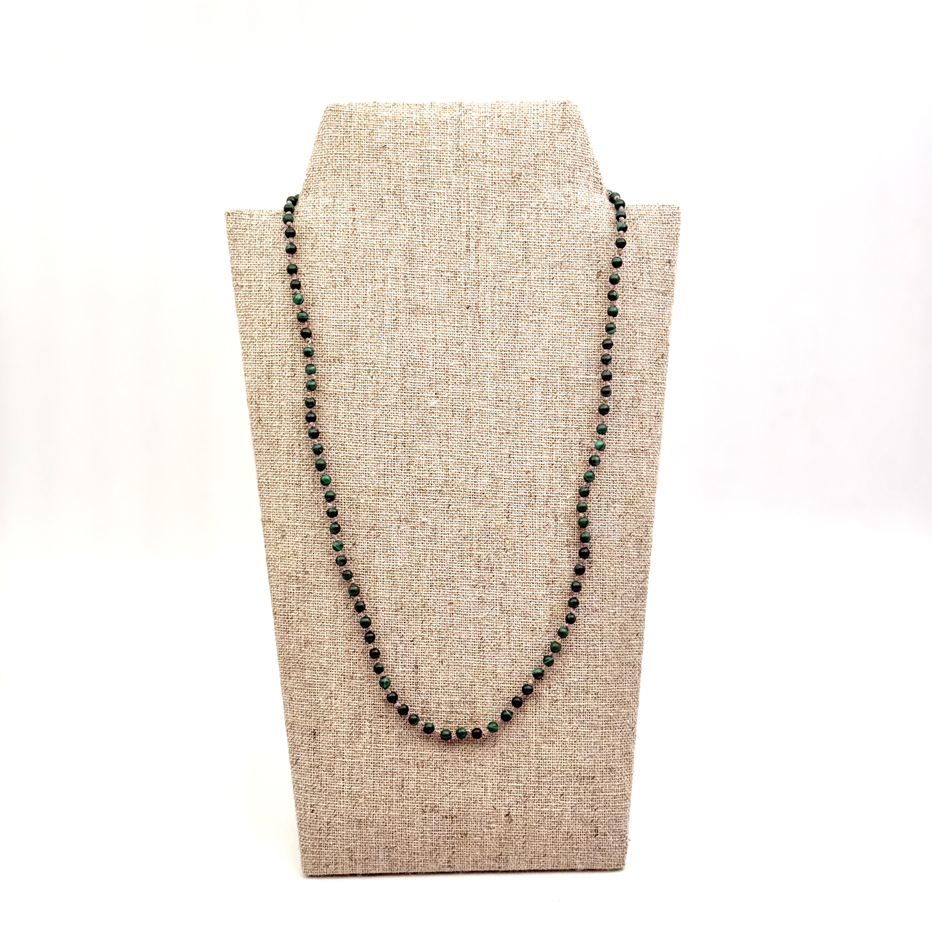 Collier sur fil noué composé de perles de malachite de 3mm de diamètre.