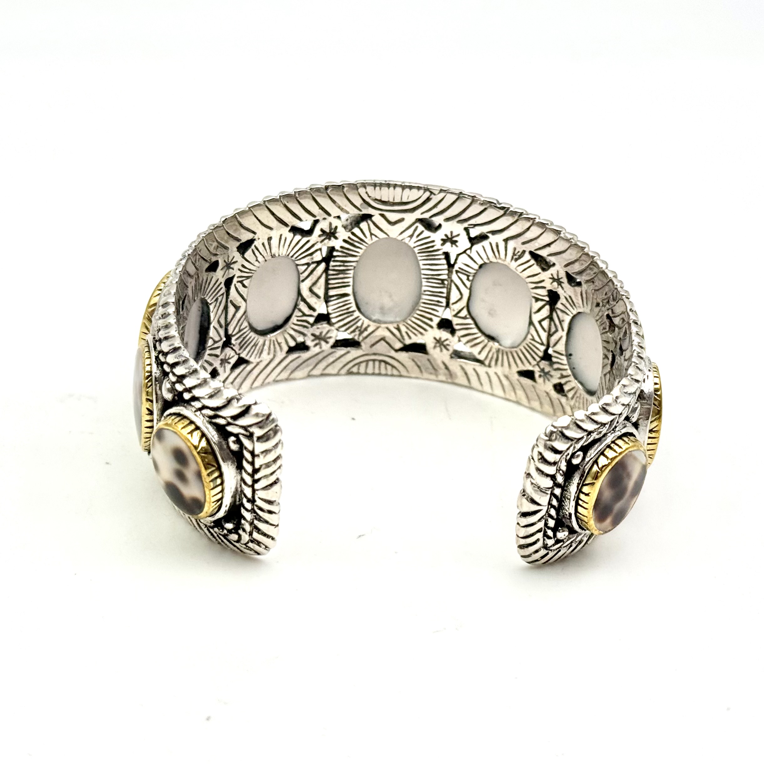 Magnifique manchette en argent massif 925 composé de 9 coquillages porcelaine tigrée ovales serties de laiton.